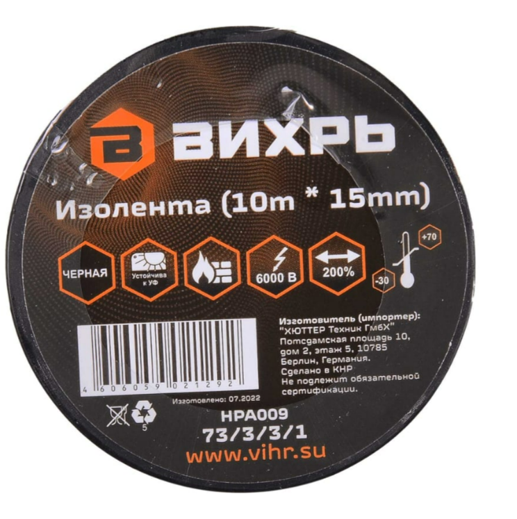 Изолента ПВХ Вихрь, чёрная, длина 10м, ширина 15мм, 1шт