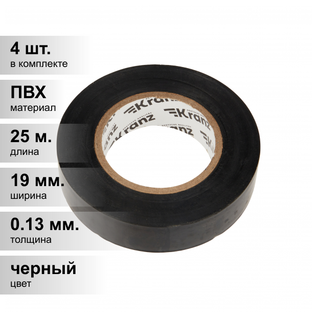 Изолента ПВХ KRANZ 0.13х19 мм, 25 м, черная Kranz KR-09-2206, KR092206 (упаковка 5 шт.), KRANZ KR-09-2206