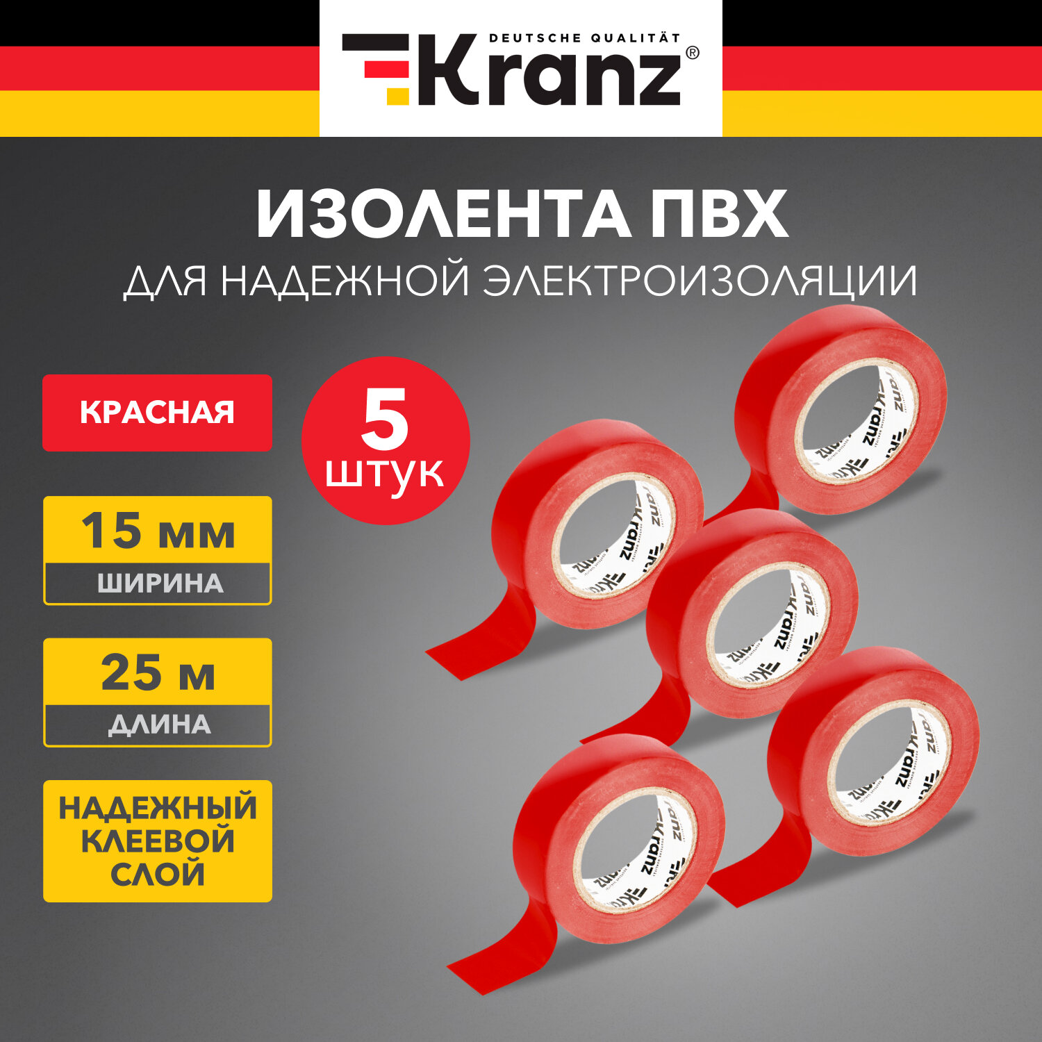 Купить Лента Kranz электроизоляционная набор / комплект изолента красная термостойкая из ПВХ / лента цветная профессиональная для авто, проводов 25 м 5 шт
