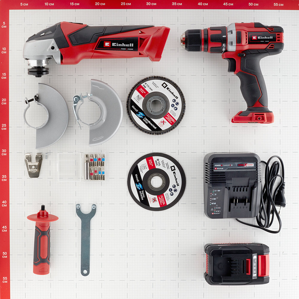 | Состав (подробно) | Аккумуляторная дрель,Угловая шлифовальная машин,Аккумулятор 4Ач,Зарядное устройство,Отрезной диск по металлу,Зачистной лепестковый диск,Дополнительный защитный кожух,Практичная сумка Einhell Bag 45/22,8 долот,Держатель долота |