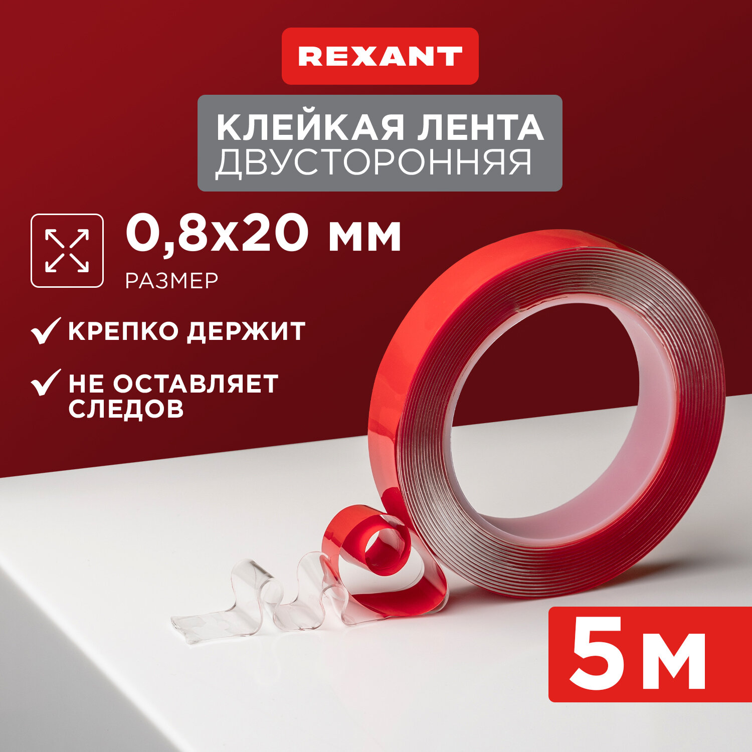 Двухсторонняя клейкая лента REXANT прозрачная, на акриловой основе, 20 мм, ролик 5 м