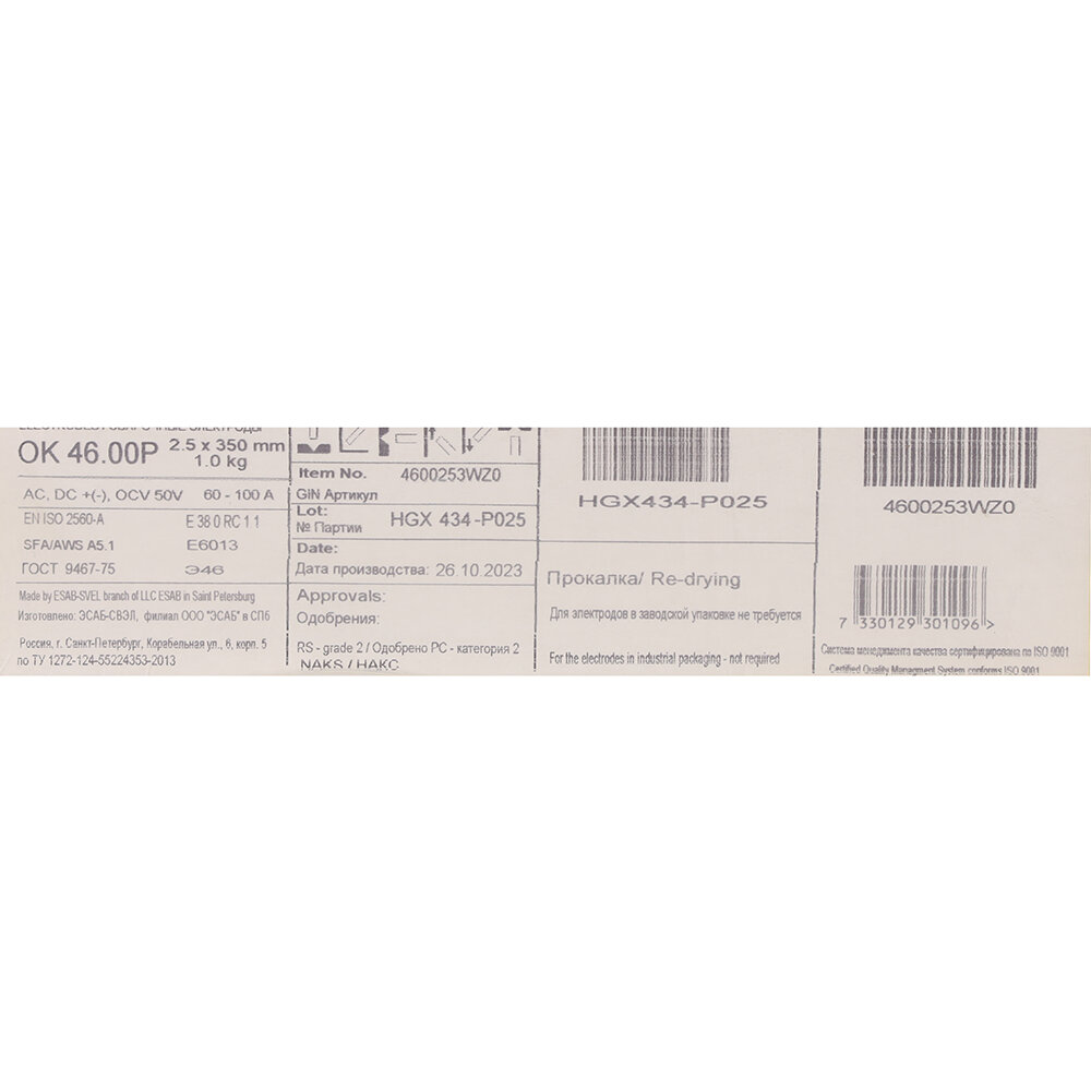 Электроды для сварки Esab ОК 46.00 ф 2,5 х 350 мм Esab 5,3 кг (4600253AM0)