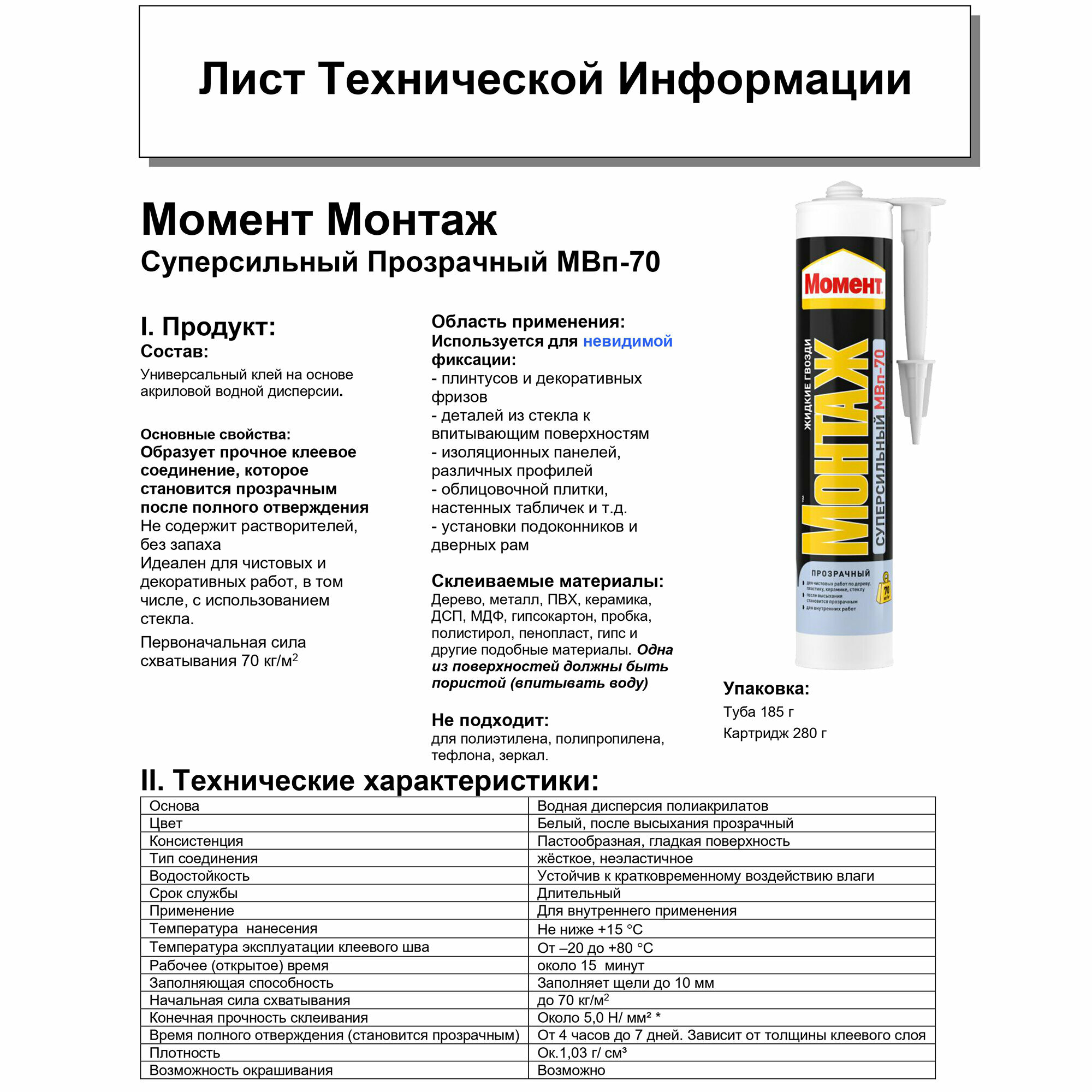 Момент Монтаж Суперсильный MB-70 клей монтажный (0,4кг) / момент Монтаж Суперсильный МВ-70 жидкие гвозди (картридж 400г) белый