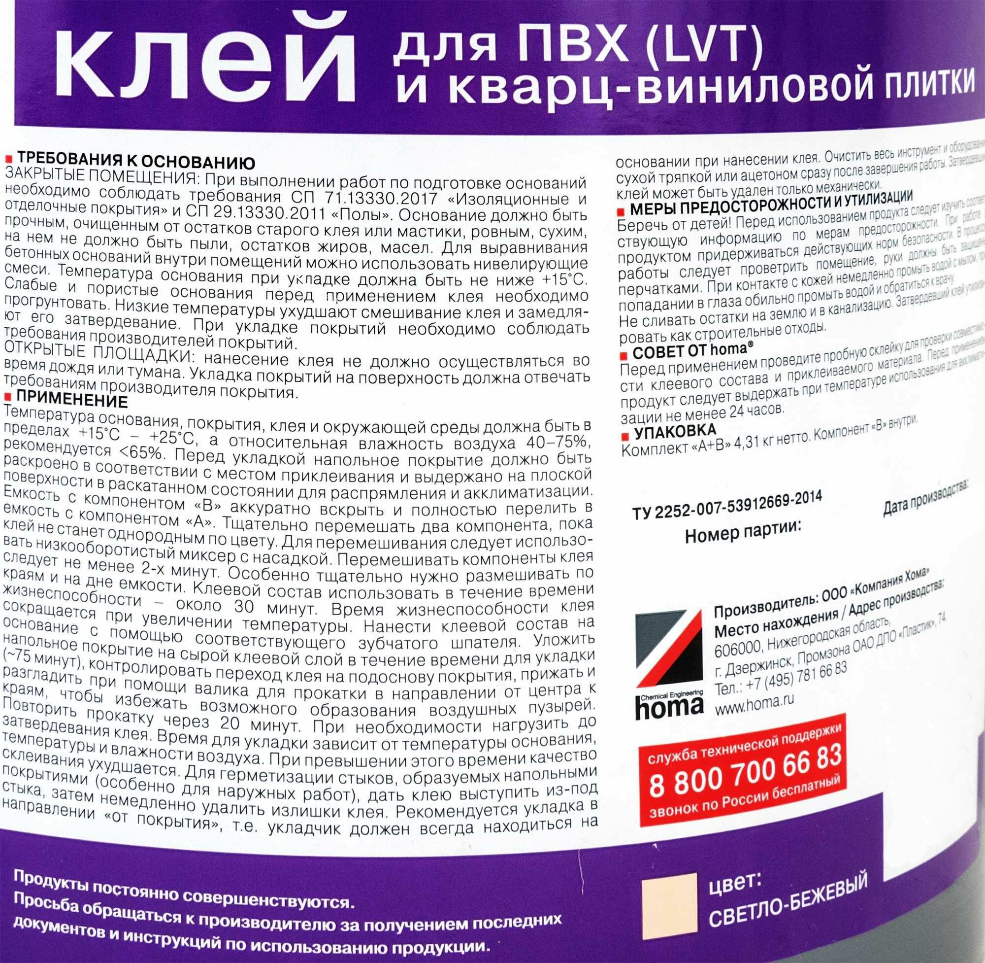 Клей для напольных модульный ПВХ-покрытий (LVT, кварц-винил) homakoll TILE 4,31 кг интересное:
