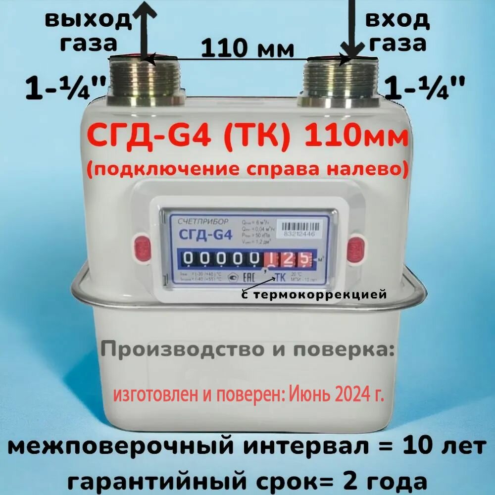Счетчик газа СГД-G4 ТК с термокоррекцией (вход газа с права, 110мм, резьба 1 1/4" (дюйм с четвертью) )