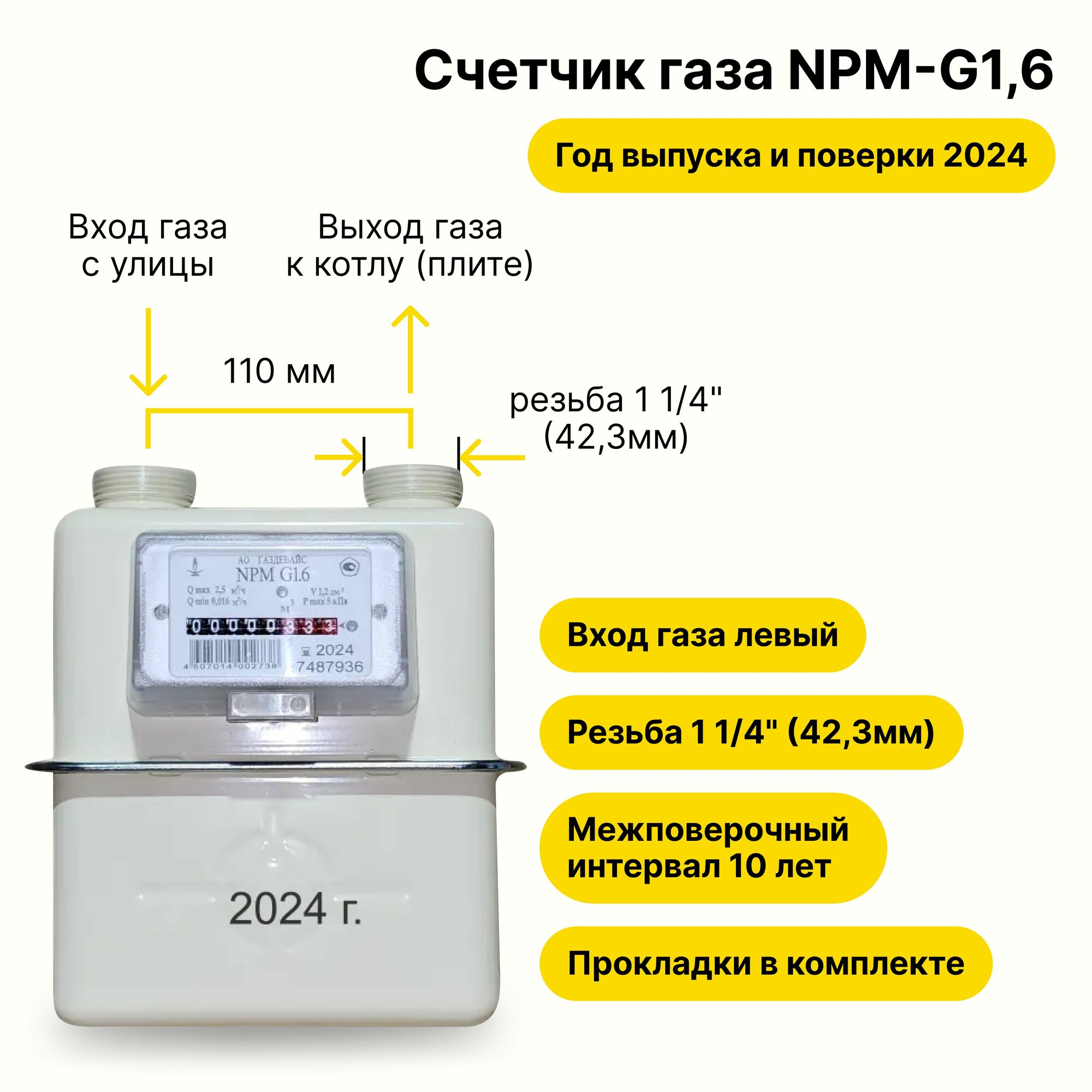 Счетчик газа NPM-G1,6 (вход газа левый -->, резьба 1 1/4", прокладки В комплекте) 2024 года выпуска и поверки