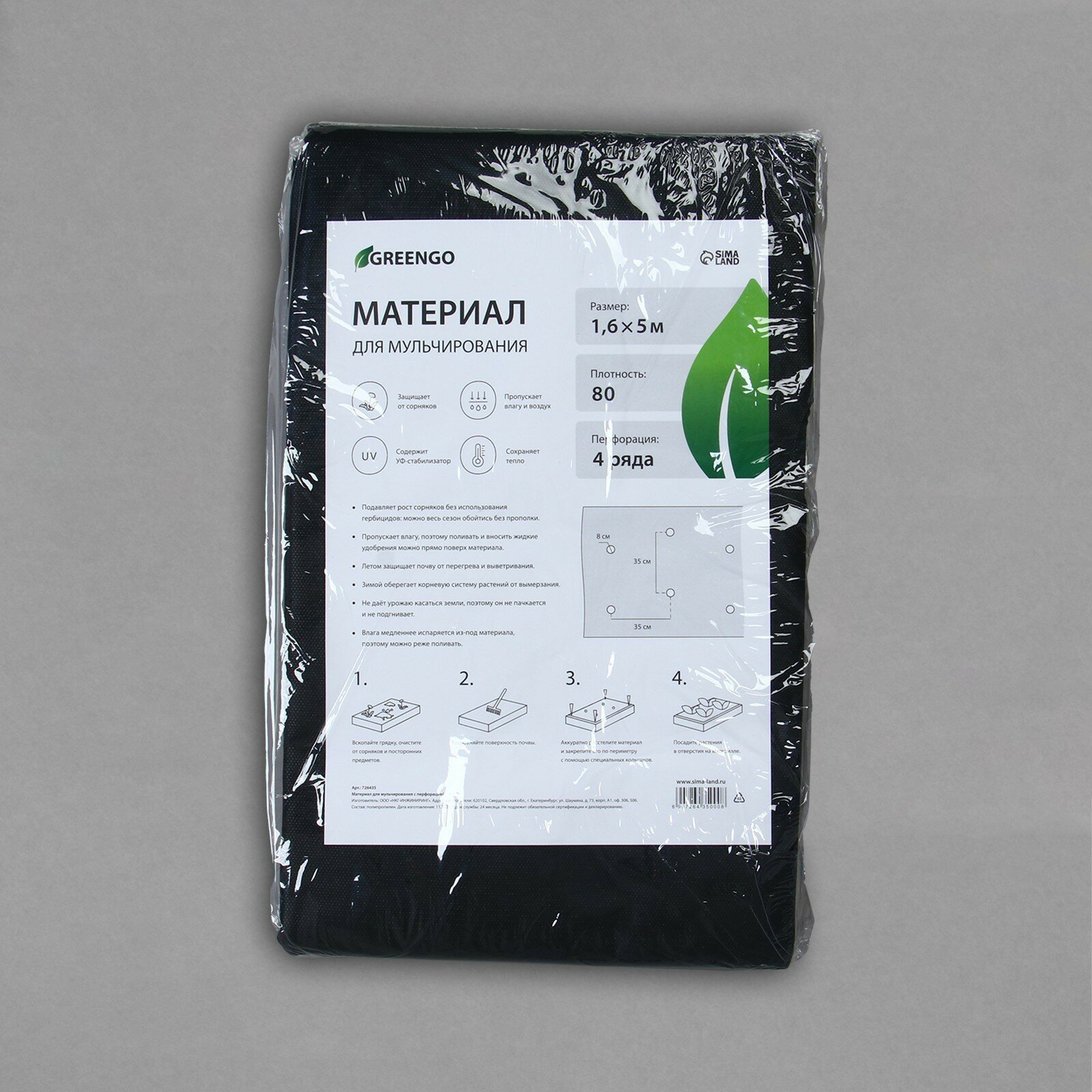 Купить Материал мульчирующий, плотность 80, УФ, 1,6*5м, 4 ряда перфорации (о) Greengo Эконом 20% 726435