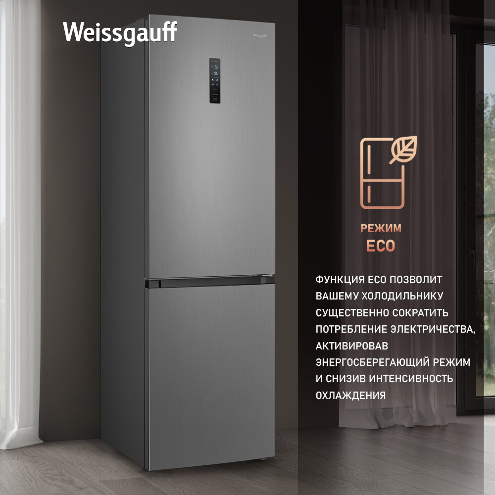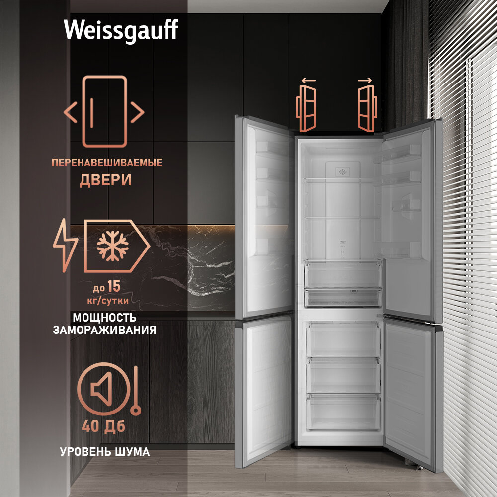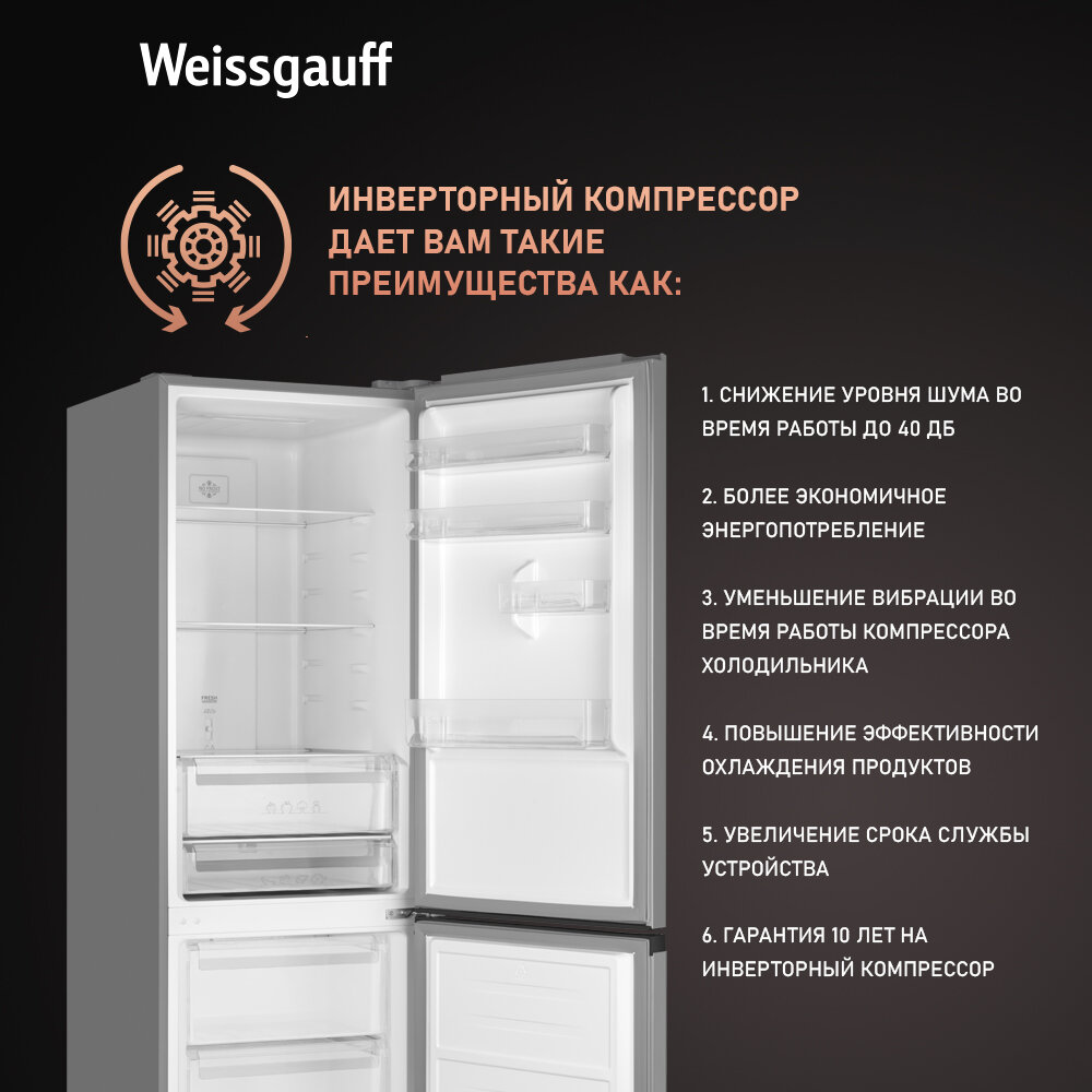 Отдельностоящий холодильник с инвертором Weissgauff WRK 2000 Total NoFrost Inverter Black Inox двухкамерный шириной 60 см, 3 года гарантии, Тихий режим 40 дБ, Полезный объём 342л, Электронное управление, Супер заморозка 15кг сутки, Зона свежести, А++