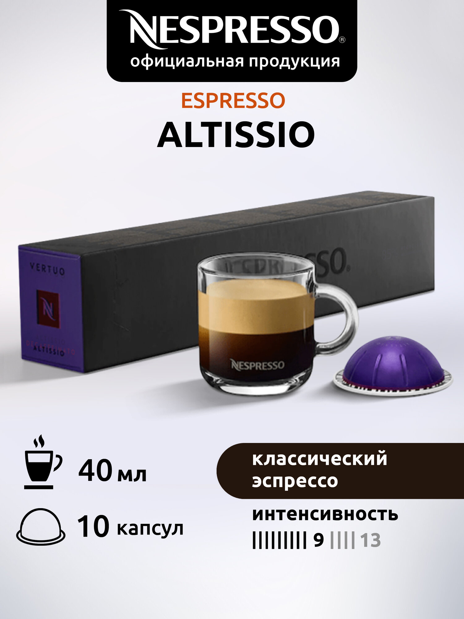 Кофе в капсулах Nespresso Vertuo, бленд Altissio Decaffenato, 40 ml, 9/11, 10 капсул