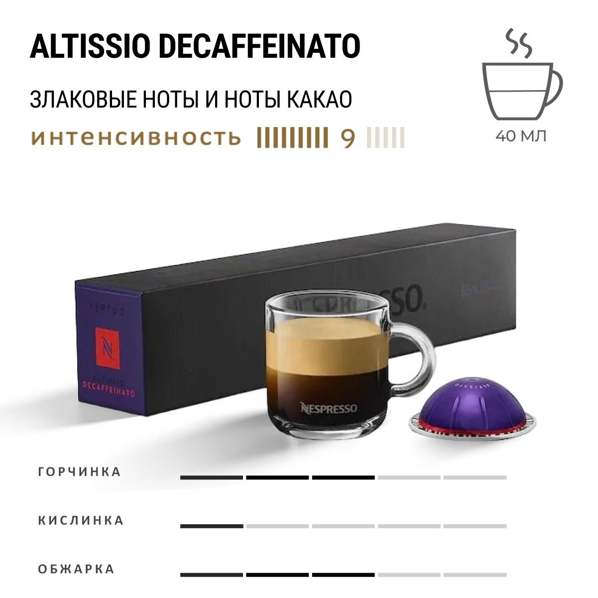 Кофе в капсулах Nespresso Vertuo, бленд Altissio Decaffenato, 40 ml, 9/11, 10 капсул