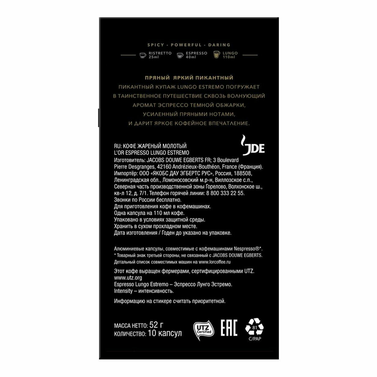 Кофе в алюминиевых капсулах L'or Espresso Lungo Estremo, для системы Nespresso, 10 штук, 52 г интересное:
