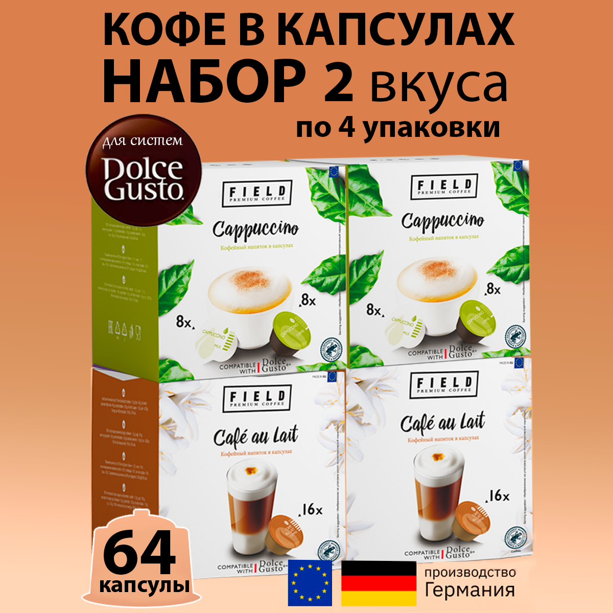 Кофе капсулы Field Dolce Gusto Cafe au Lait Cappuccino набор 64шт