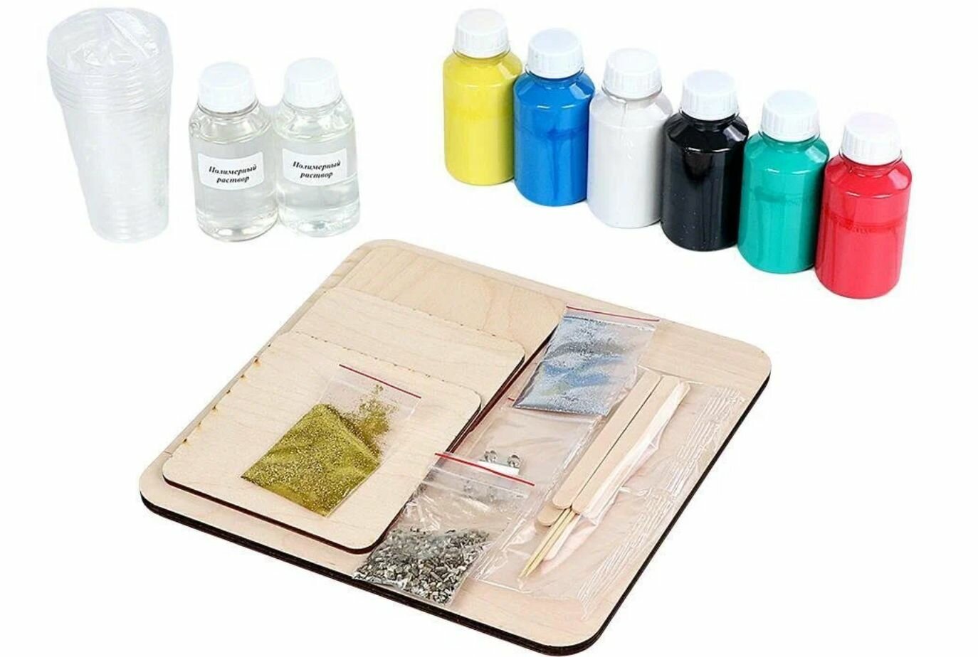 | Комплектация | 6 флаконов с красками; 3 основы для живописи; 1 основа для живописи; 2 флакона с полимерным связующим; 6 палочек для размешивания; 6 стаканчиков для смешивания красок; 2 шпажки; 2 пакетика с глиттером; 1 пакетик с декоративным наполнителем; 1 крючок-подвес; перчатки; инструкция. |