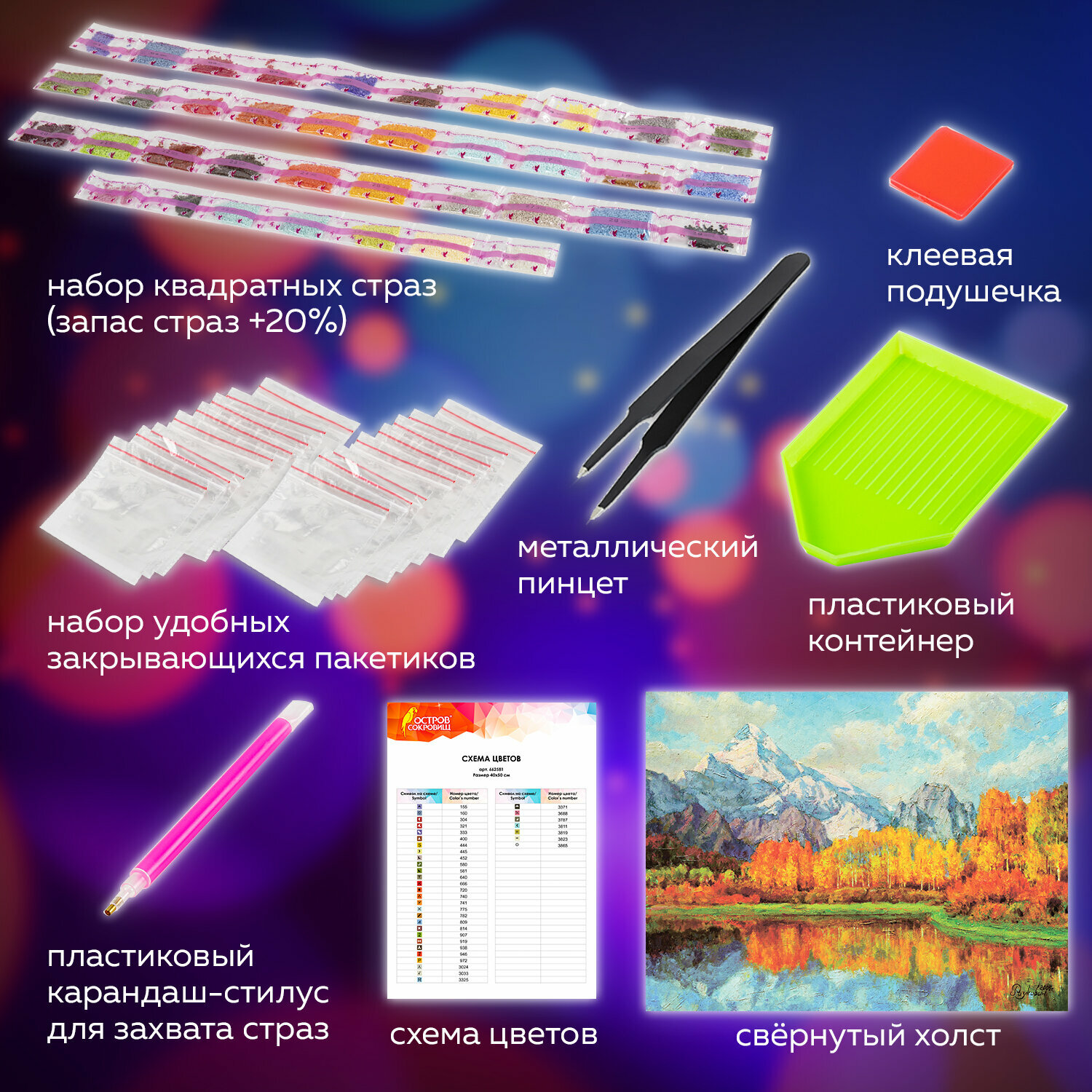 | Особенности | лоток для страз / пинцет / подрамник / с цифрами / стилус / холст / цветная схема / ювелирная огранка |