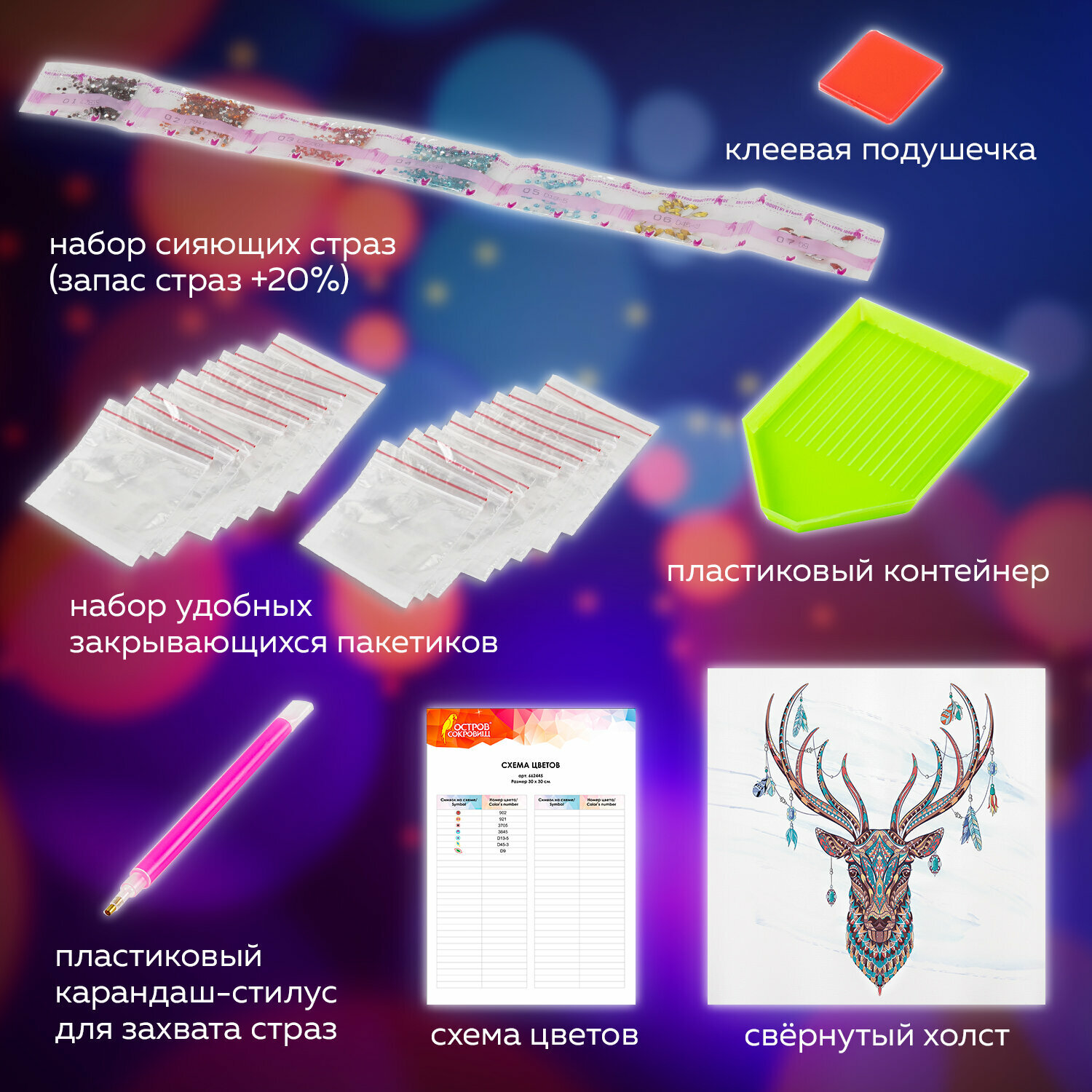 | Особенности | лоток для страз / пинцет / подрамник / с цифрами / стилус / холст / цветная схема / ювелирная огранка |