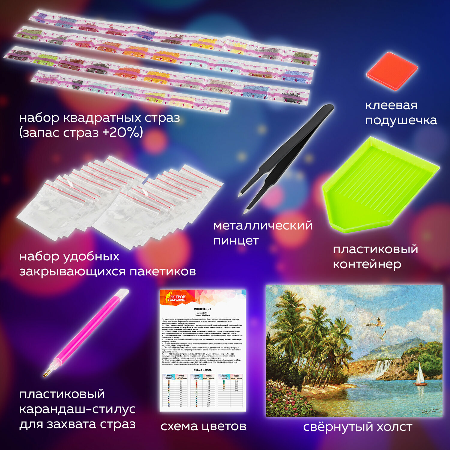 | Особенности | лоток для страз / пинцет / подрамник / с цифрами / стилус / холст / цветная схема / ювелирная огранка |