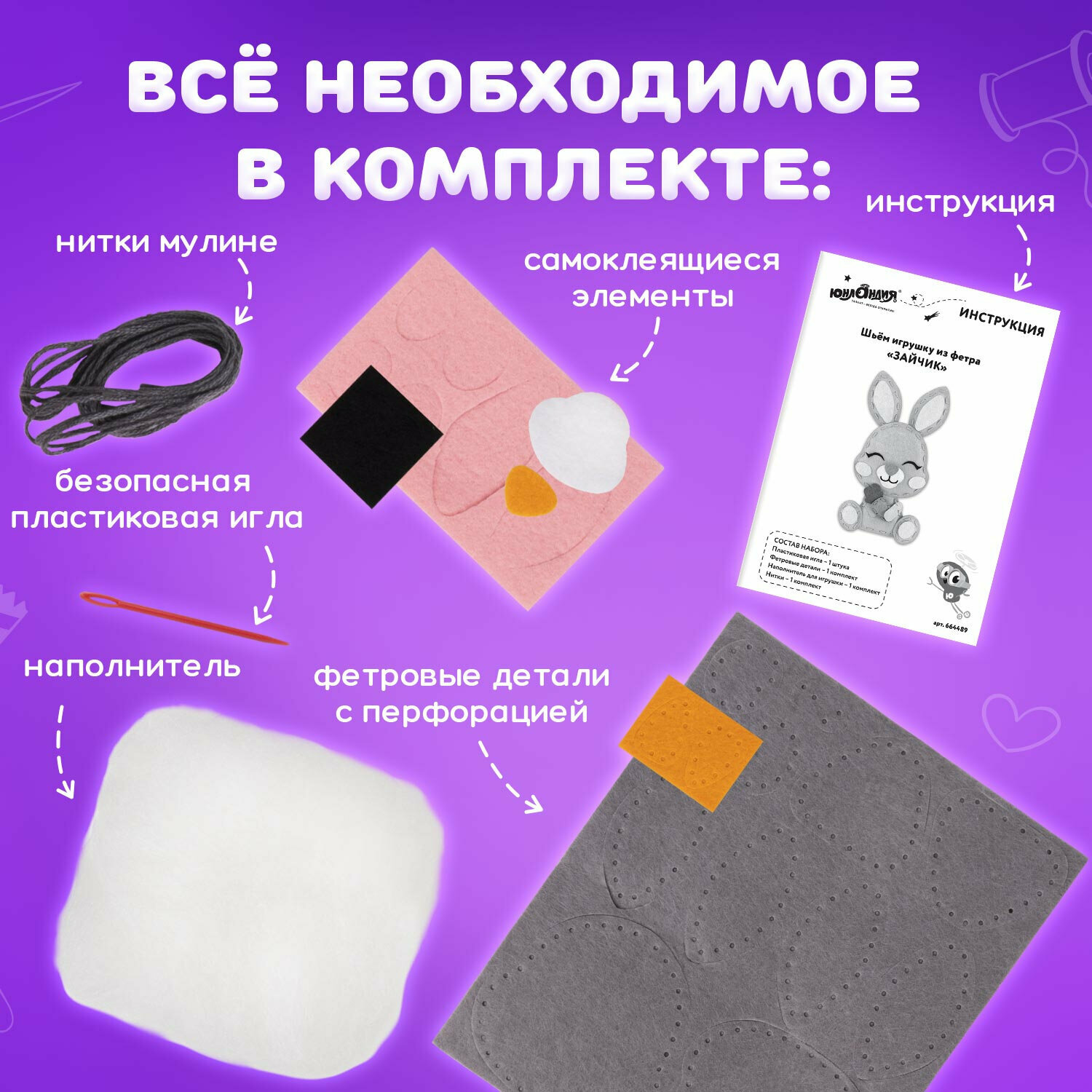 СохранитьНабор для творчества и рукоделия для шитья игрушки из фетра для девочек / детей Зайчик, Юнландия интересное: