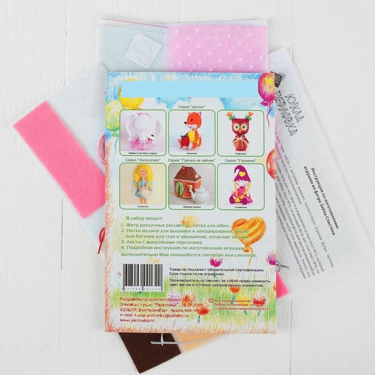 | Комплектация | - фетр различных расцветок; - сетка для юбки; - нитки мулине; - бисер для глаз; - атласная тесьма; - выкройка; - инструкция. |