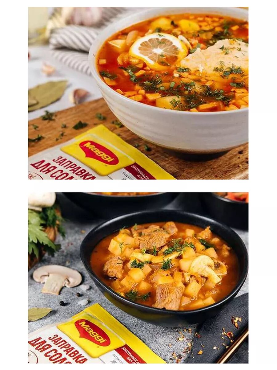 | Способ приготовления | На 2,5 л солянки вам понадобится: МАГГИ® Заправка для солянки - 180 г / куриная грудка - 200 г / копченые сосиски - 3 шт. / карбонад - 100 г / картофель - 4 шт. (~ 250 г) / лук репчатый - 1/2 шт. / растительное масло - 1 ч. ложка. 1. Сварите 1,5 л бульона из куриной грудки / добавьте нарезанный картофель. 2. Лук нарежьте полукольцами и обжарьте до золотистого цвета. 3. Когда картофель будет готов / добавьте копчености и лук / варите 2 мин. 4. Добавьте Заправку MAGGI® для солянки и варите еще 5 мин. Рекомендуем подавать солянку с оливками / долькой лимона и зеленью. |