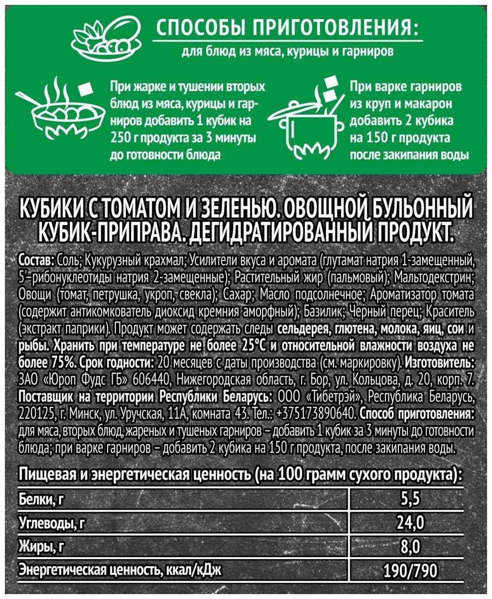 | Способ приготовления | Для мяса / вторых блюд / жареных и тушеных гарниров доюавить 1 кубик за 3 минуты до готовности блюда; при варке гарниров - добавить 2 кубика на 150 грамм продукта после закипания воды. |