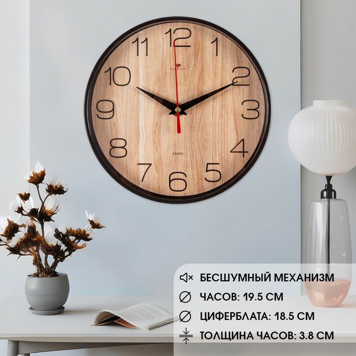 Бесшумные круглые настенные часы Рубин, часы с плавным ходом под дерево, диаметр 19.5 см, Коричневый