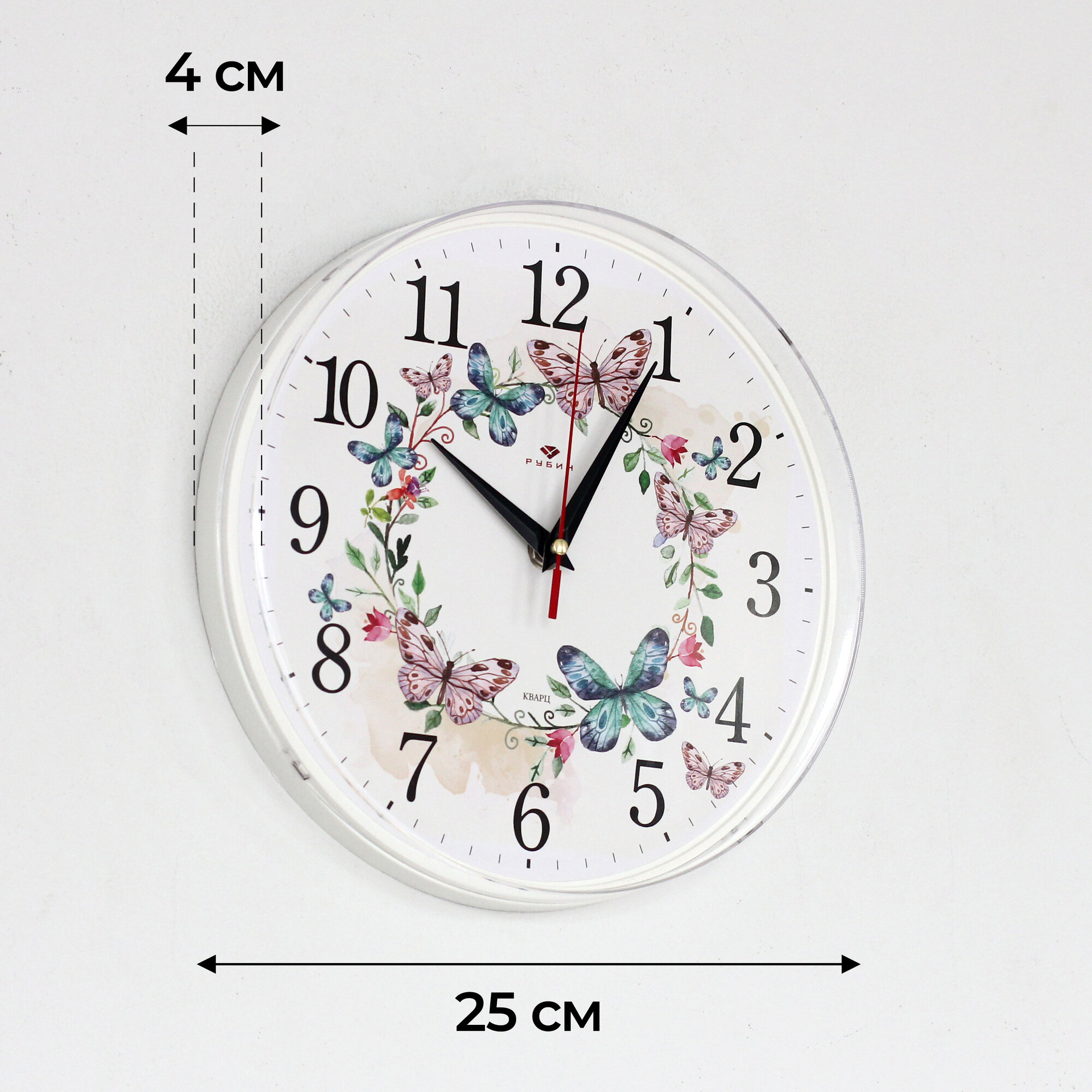 Часы настенные, кварцевые, белые, бесшумные, круглые, пластик, стекло, арабские цифры, Рубин