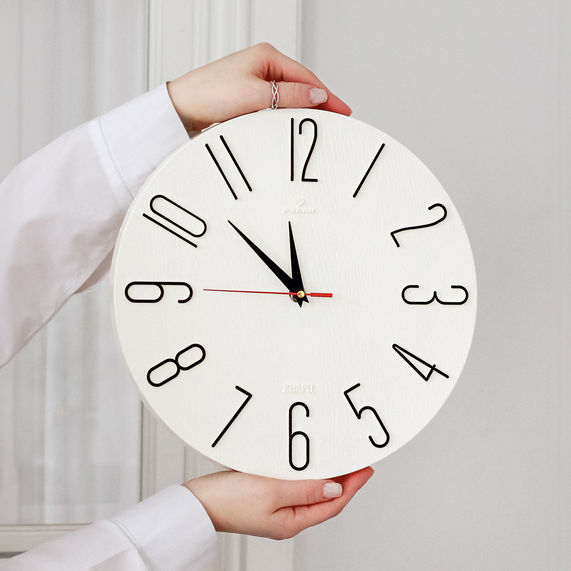 Часы настенные, кварцевые, белые, бесшумные, круглые, пластик, стекло, арабские цифры, Рубин