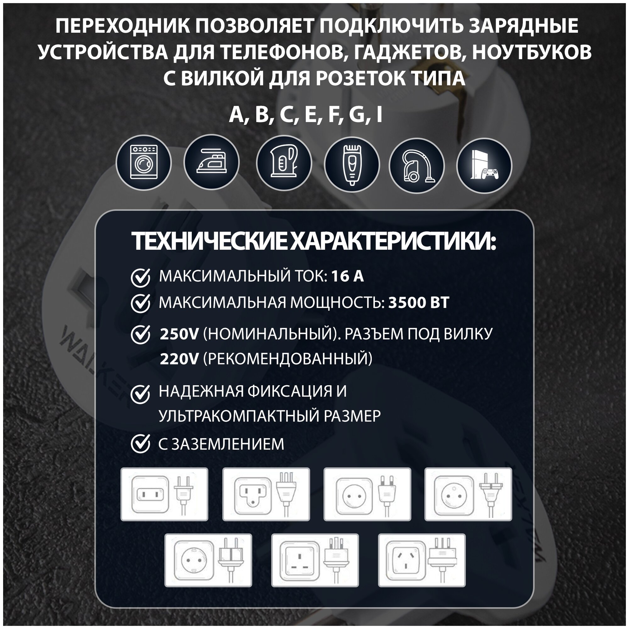 Универсальный плоский переходник для китайской розетки, WALКЕR, евровилка, сетевой адаптер с американской на русскую