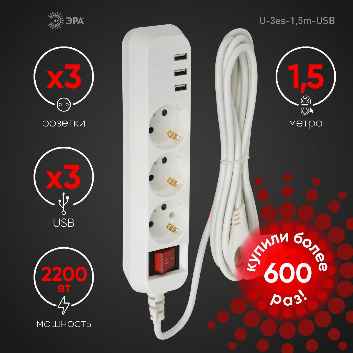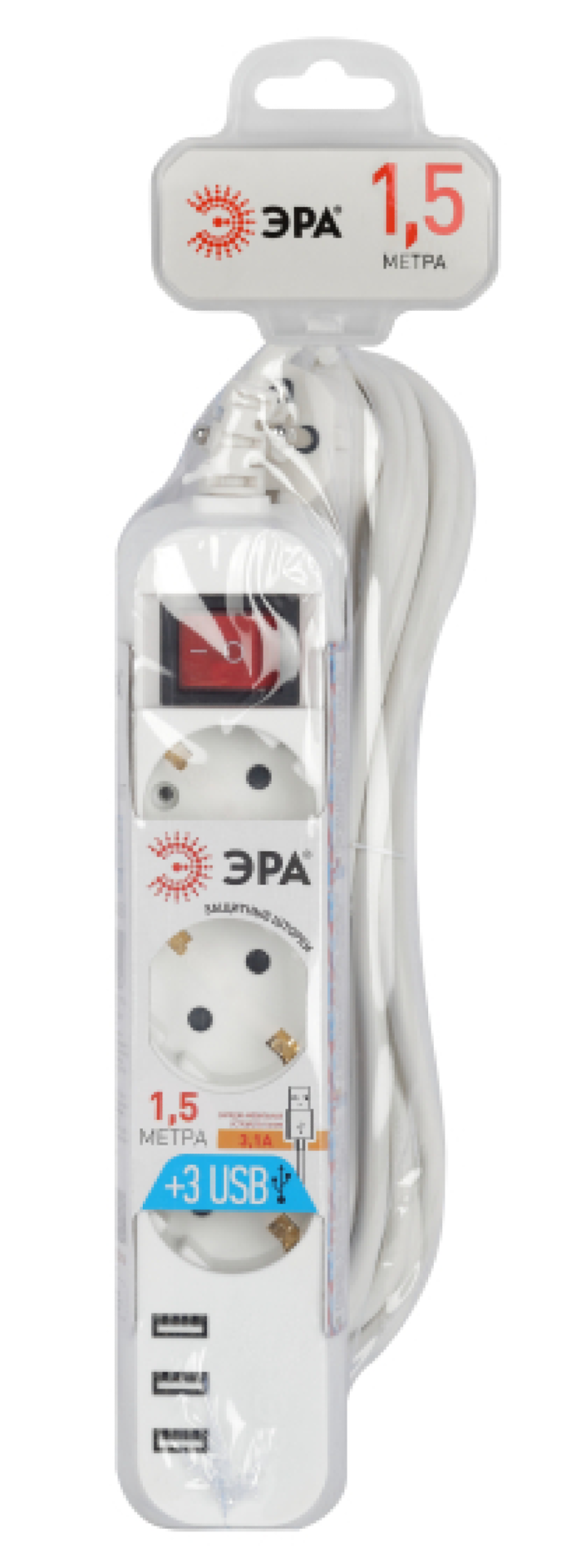 Удлинитель сетевой электрический с заземлением и выключателем ЭРА U-3es-1,5m-USB 3 розетки, 3xUSBA, 1,5м, 10А интересное: