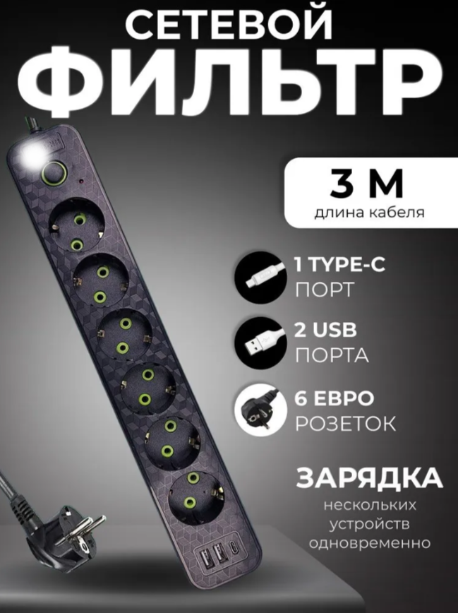 Ниже Вы можете прочитать отзывы на Сетевой фильтр с 6 розетками 2USB + 1 Type-C / Многофункциональный удлинитель с предохранителем, ознакомится с подробными характеристиками, посмотреть интересные обзоры и фотографии на Сетевой фильтр с 6 розетками 2USB + 1 Type-C / Многофункциональный удлинитель с предохранителем.