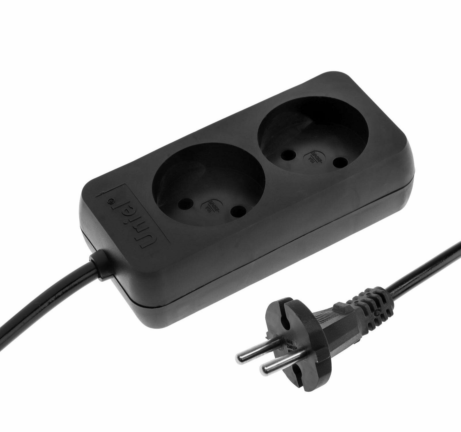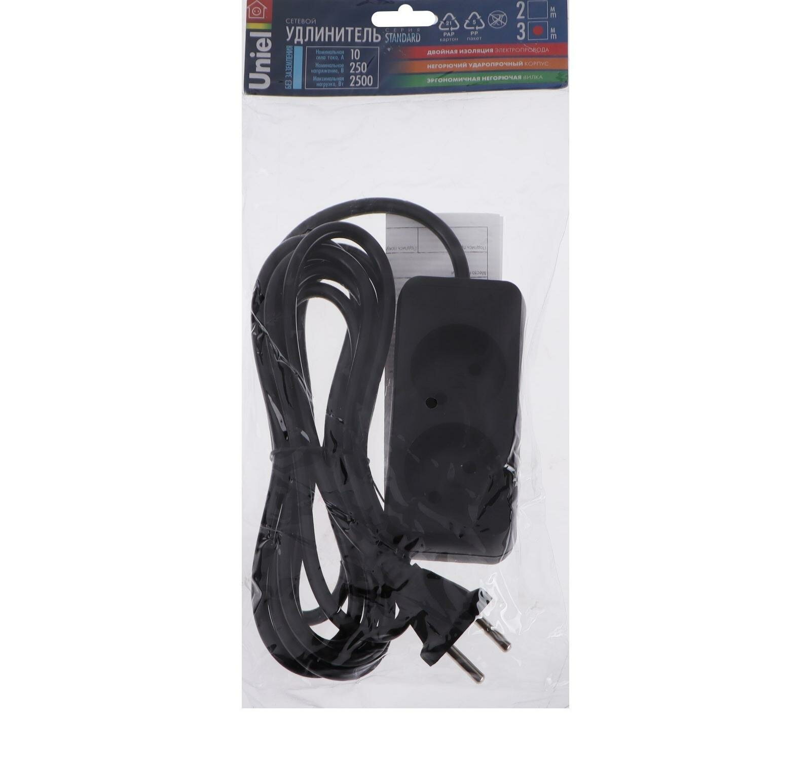 Удлинитель Uniel Standart, 2 розетки, 3 м, 10 А, 2500 Вт, без з/к, черный