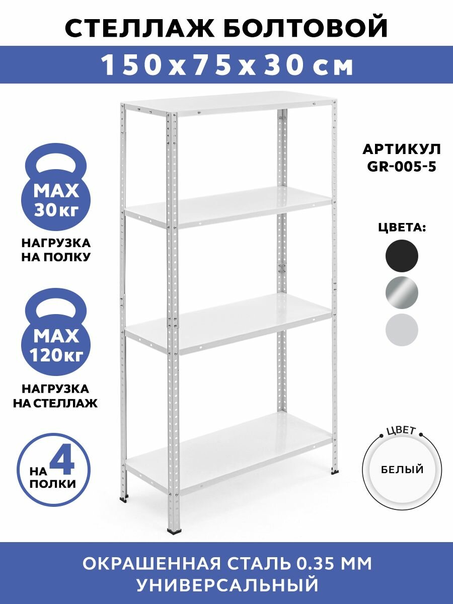 Стеллаж металлический болтовой GASTRORAG GR-005-5, 4 полки, размеры 150х75х30 см, этажерка для кухни, мебель лофт, подставка для цветов и рассады, система хранения для дома, дачи и гаража