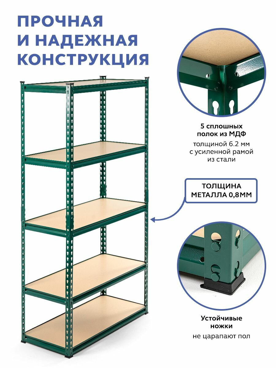| Дополнительная информация | материал полки - влагостойкий МДФ 6.2 мм; максимальная нагрузка на полку - 175 кг, на весь стеллаж - 875 кг; высота полок регулируется с шагом 30 мм |