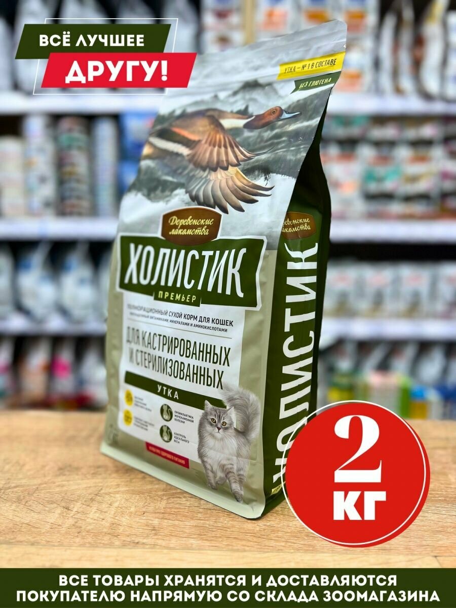 Корм сухой Деревенские Лакомства холистик премьер полнорационный, для стерилизованных кошек с уткой, 2 кг