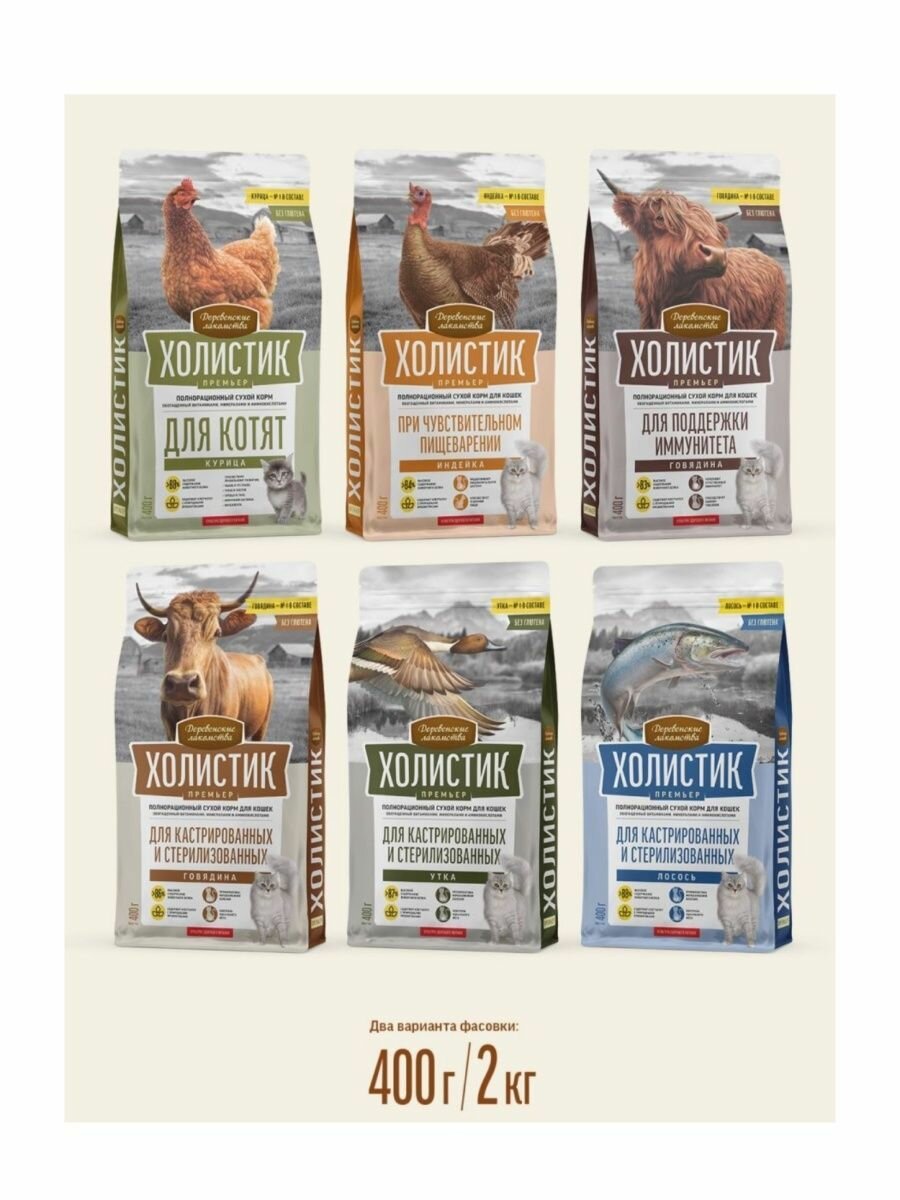 2кг+2кг Сухой полнорационный корм деревенские лакомства холистик премьер для поддержки иммунитета кошек с говядиной