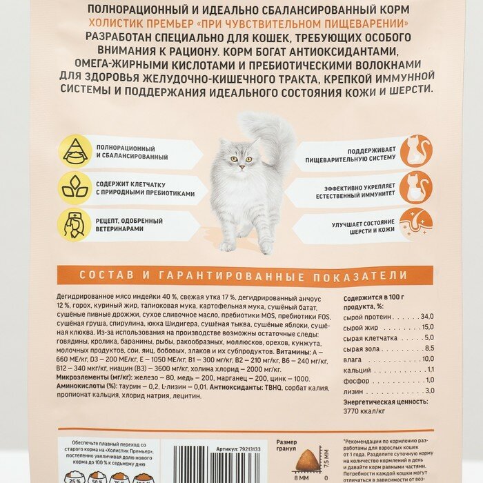 Деревенские лакомства холистик премьер полнорационный сухой корм для кошек при чувствительном пищеварении с индейкой 400г