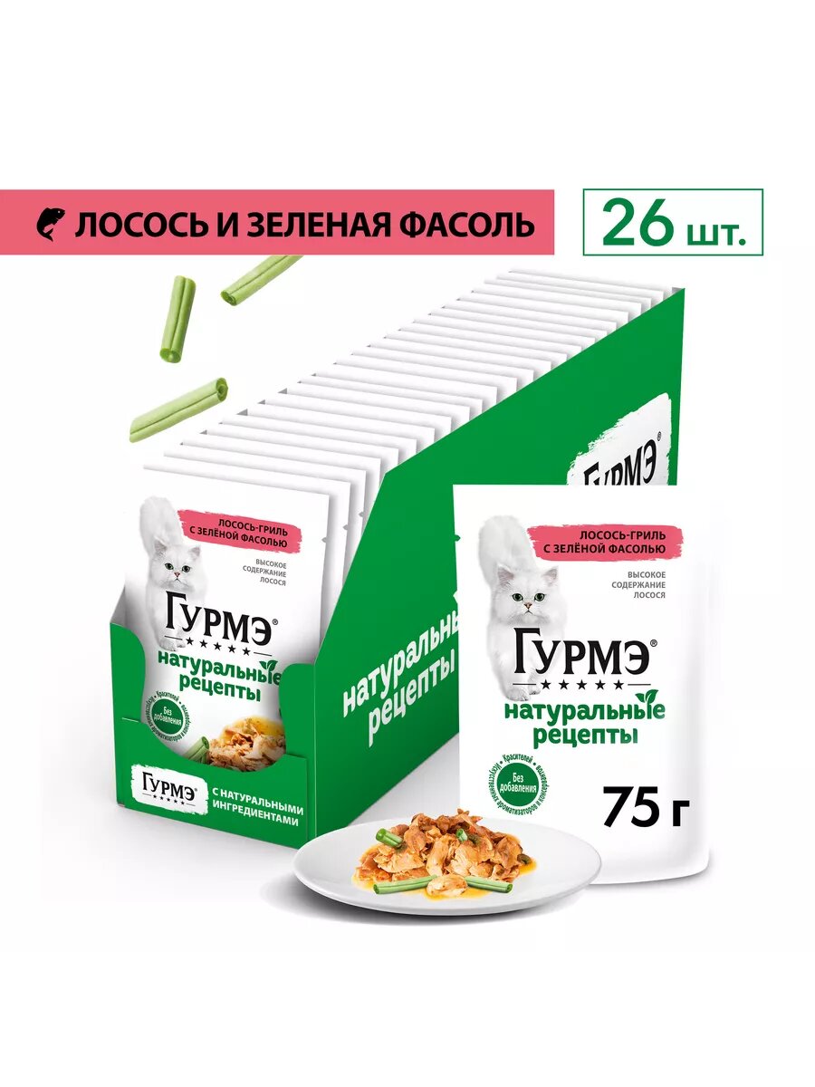 Купить Корм консервированный гурмэ натуральные рецепты для взрослых кошек с лососем-гриль и зеленой фасолью (75 гр х 26 шт)