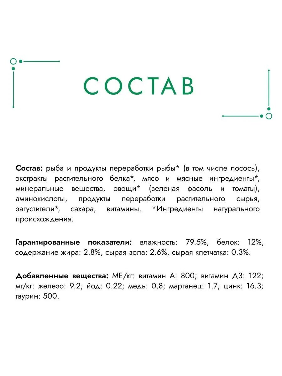 СохранитьКорм консервированный гурмэ натуральные рецепты для взрослых кошек с лососем-гриль и зеленой фасолью (75 гр х 26 шт) интересное: