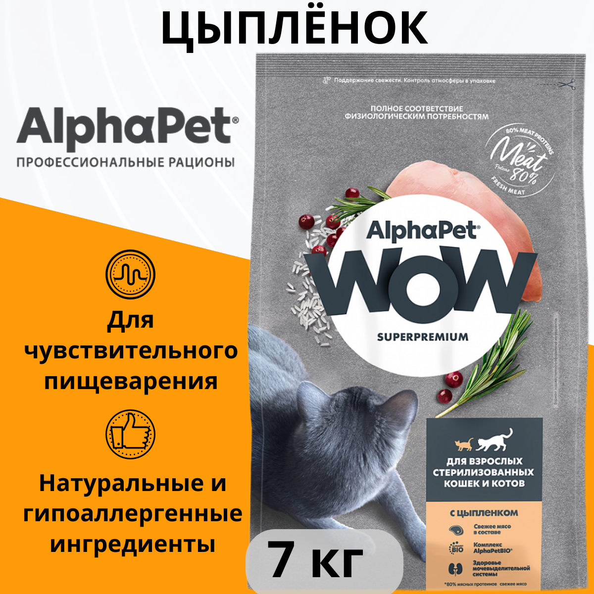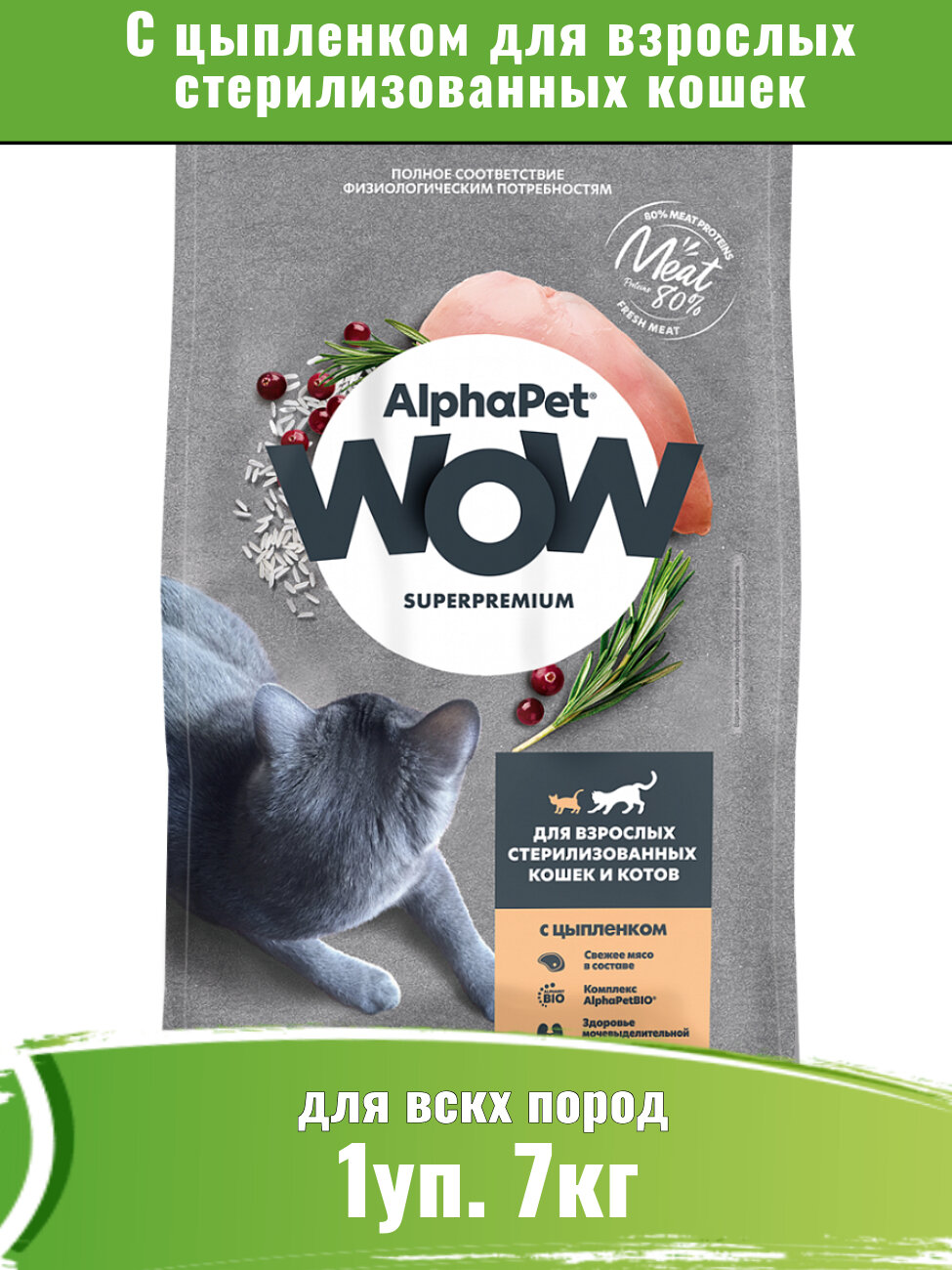Купить AlphaPet Wow - Сухой корм для взрослых стерилизованных котов и кошек, с Цыпленком (7 кг)