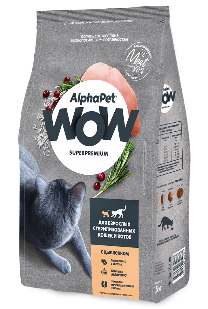 Корм AlphaPet WOW Superpremium для стерилизованных кошек и котов, c цыпленком,1.5 кг