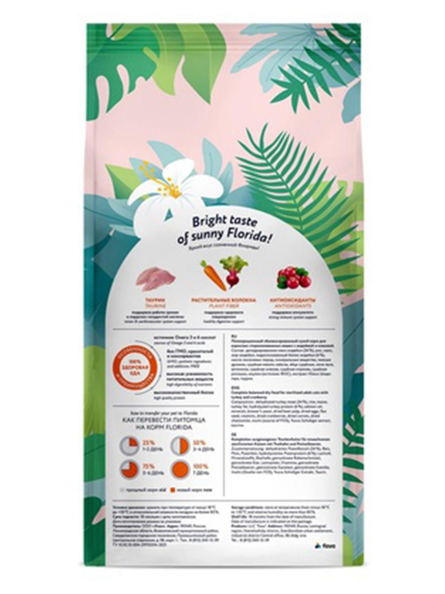 FLORIDA Сухой корм для взрослых стерилизованных кошек с индейкой и клюквой, 0,8кг
