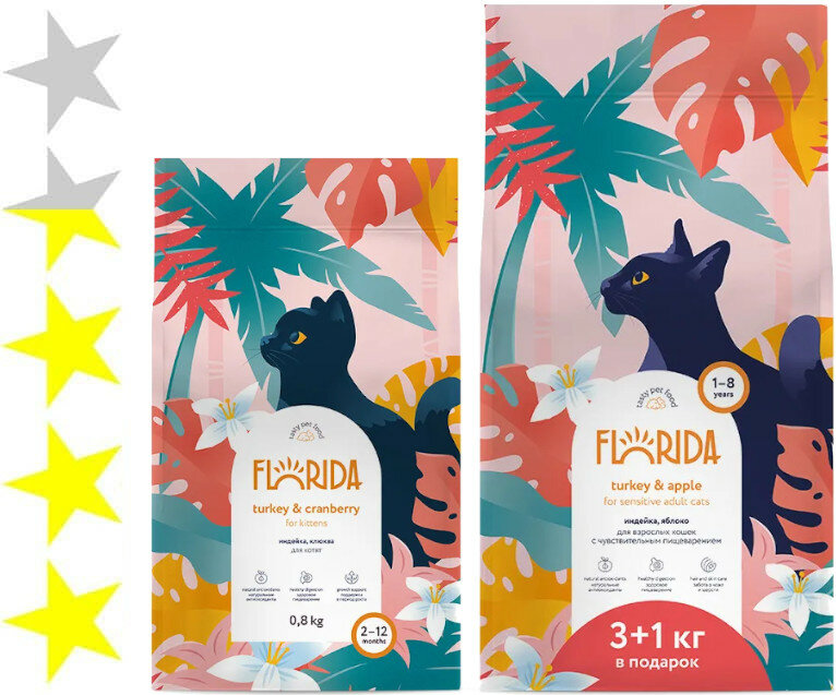 Ниже Вы можете прочитать отзывы на FLORIDA Сухой корм для взрослых стерилизованных кошек и котов с индейкой и клюквой, 3 кг + 1 кг в подарок, ознакомится с подробными характеристиками, посмотреть интересные обзоры и фотографии на FLORIDA Сухой корм для взрослых стерилизованных кошек и котов с индейкой и клюквой, 3 кг + 1 кг в подарок.