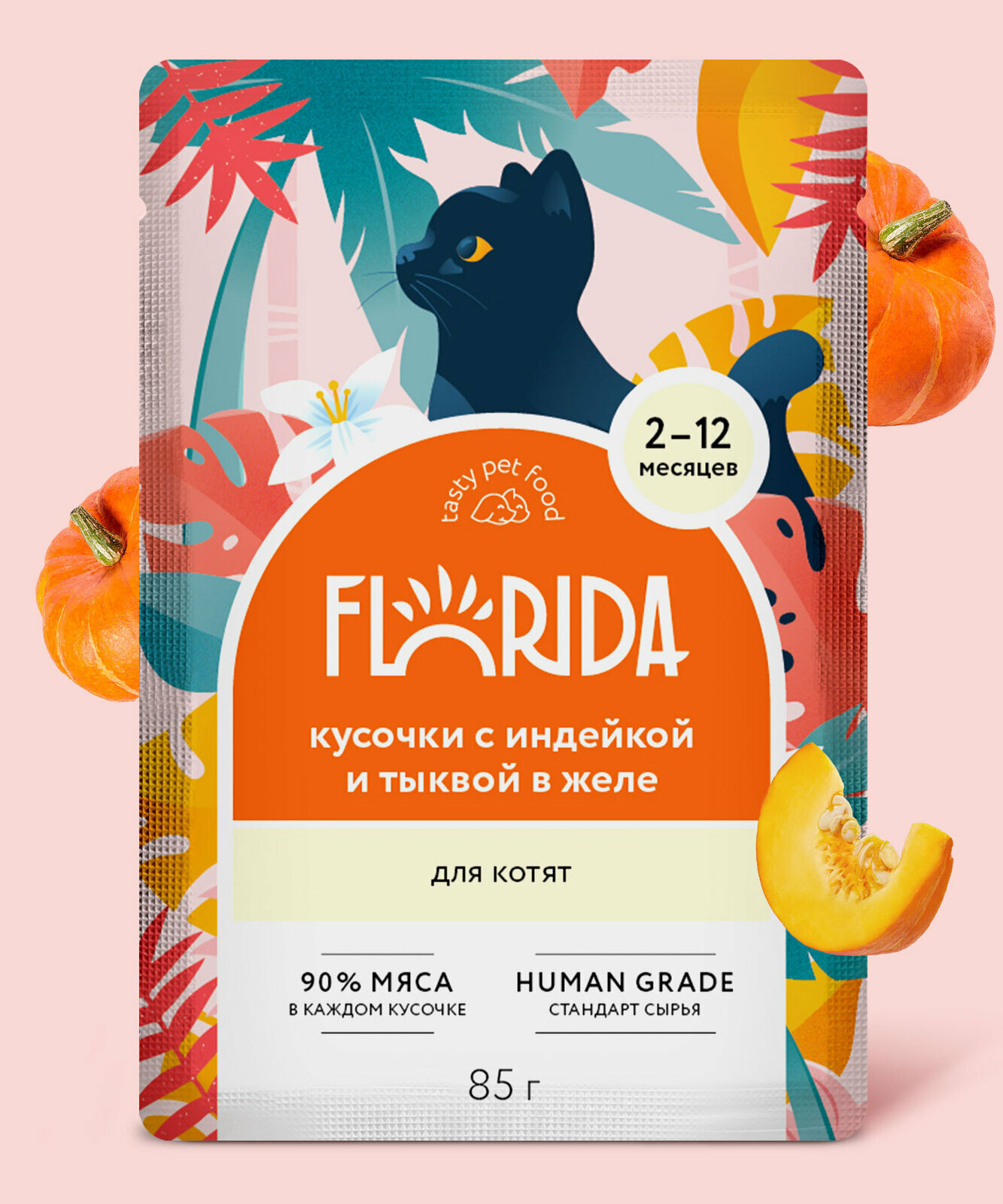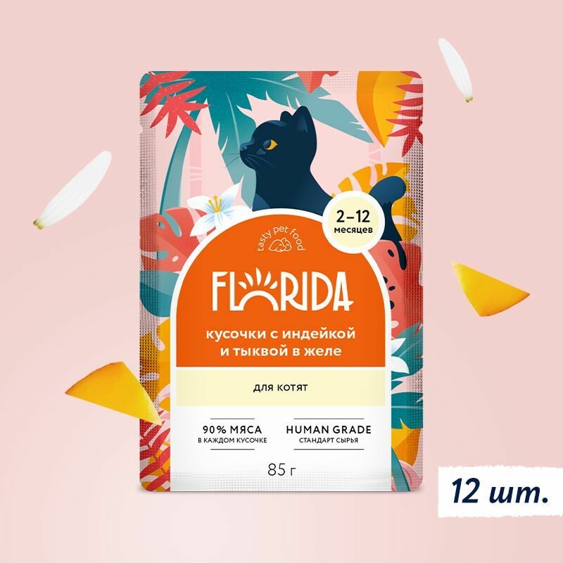 Florida паучи для котят с индейкой и тыквой, кусочки в желе - 85 г x 12 шт