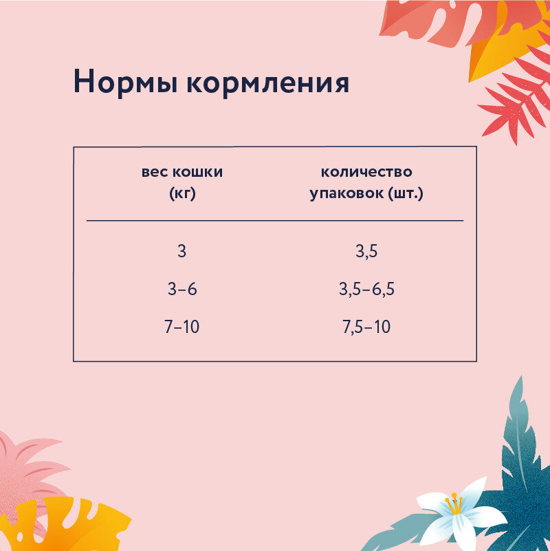 | Дополнительная информация | Переход с предыдущего рациона осуществлять постепенно, небольшими порциями в течение 5-7 дней. При кормлении необходимо учитывать активность и аппетит животного. Корм должен быть комнатной температуры. Содержимое открытой упаковки хранить при температуре +5°С и использовать в течение 2 дней. У кошки всегда должен быть доступ к свежей питьевой воде. |