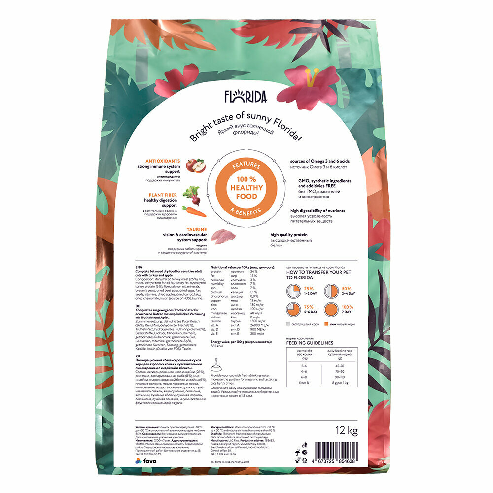 Купить 54469/54638 Florida сух.д/кошек с чувствительным пищеварением Индейка, яблоко 12кг