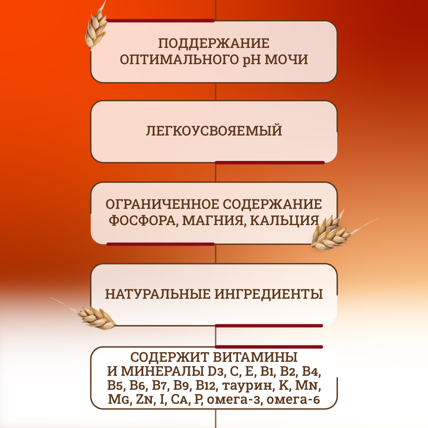 | Особые потребности | для беременных / кормящих кошек / для живущих в помещении / для здоровья кожи и блеска шерсти / для здоровья костей и суставов / для стерилизованных/кастрированных / при чувствительном пищеварении / профилактика МКБ |