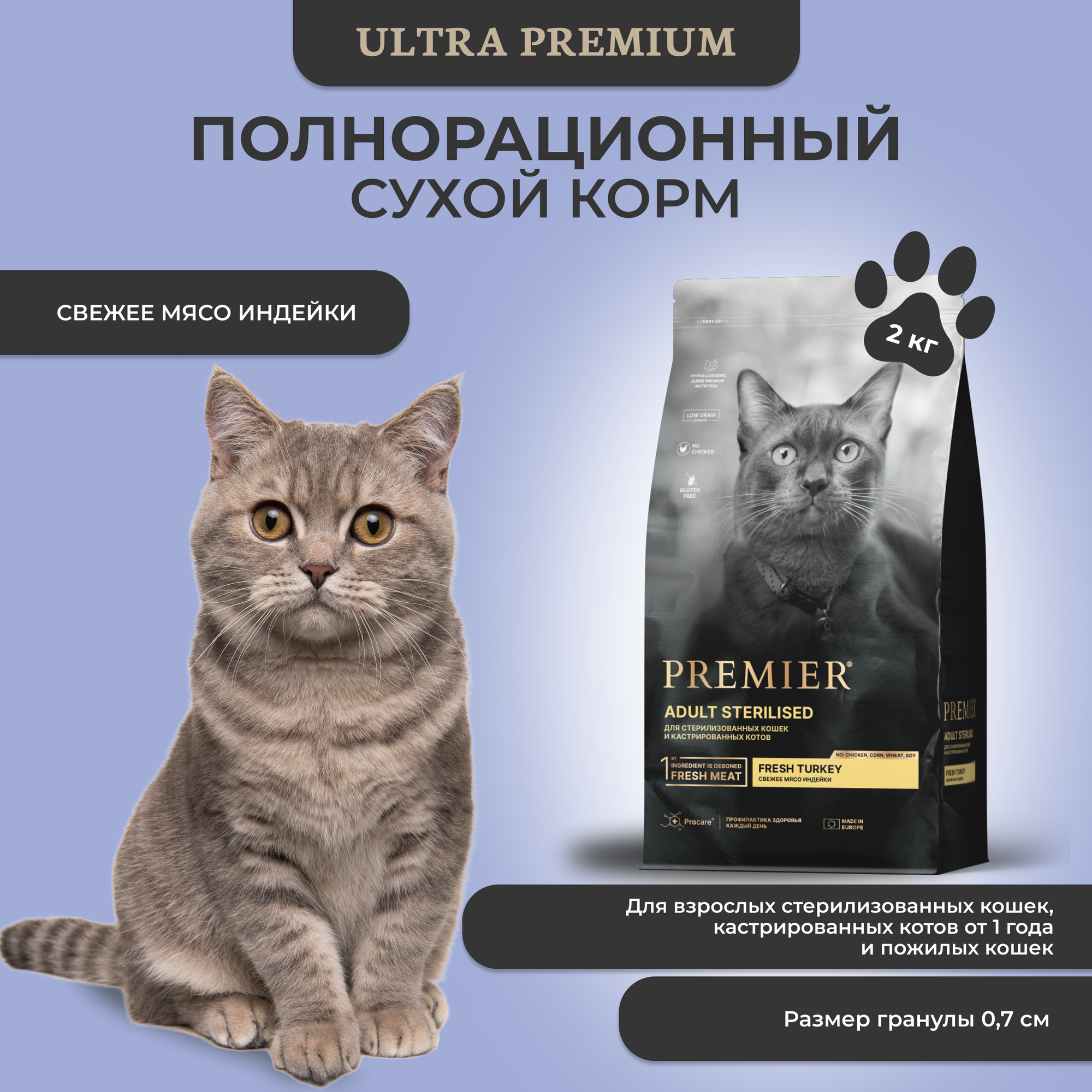 Сухой корм Premier Cat Turkey STERILISED из свежего мяса индейки для кошек 2 кг