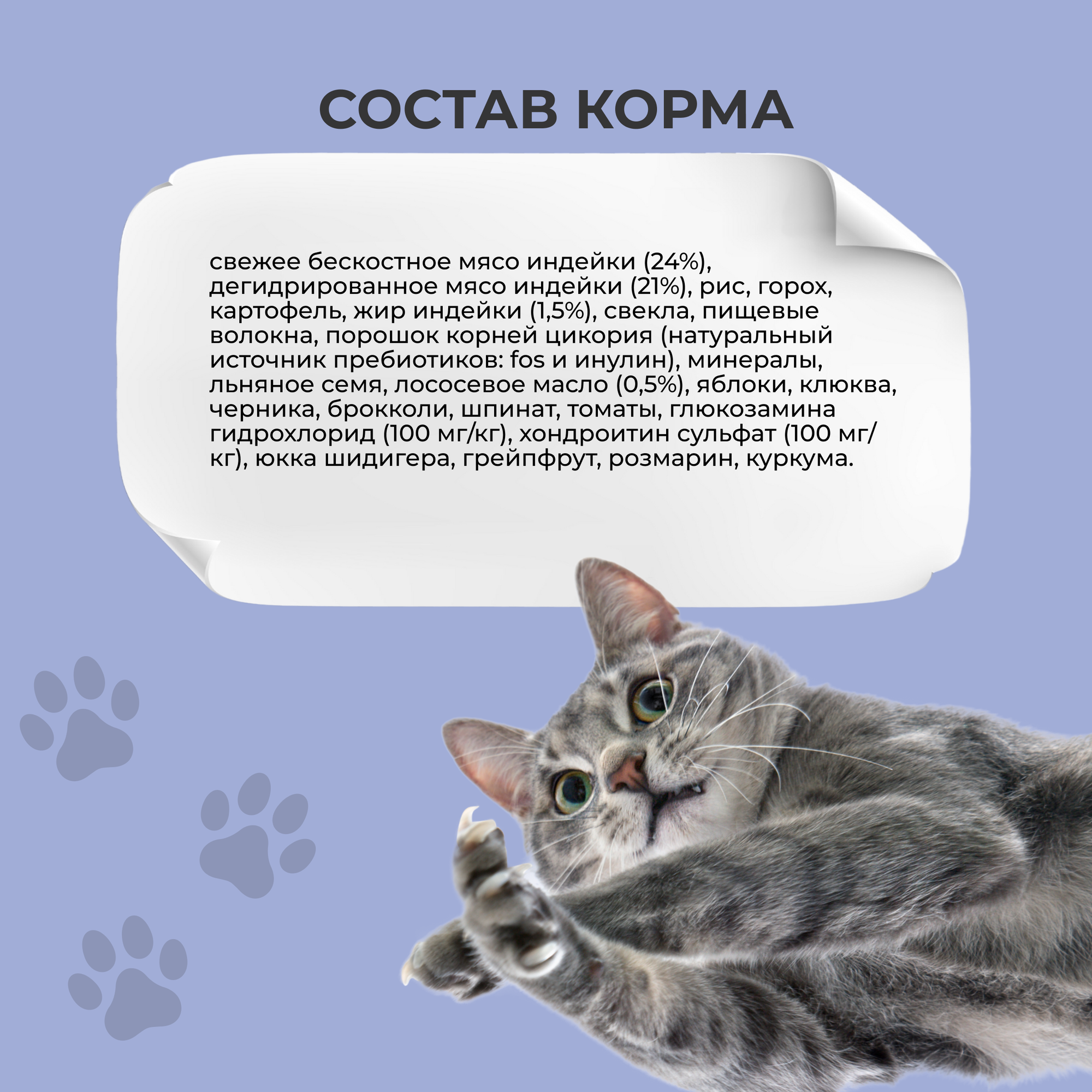 | Особые потребности | беззерновой / гипоаллергенный / для вывода шерсти / для живущих в помещении / для живущих на улице / для здоровья кожи и блеска шерсти / для здоровья костей и суставов / для стерилизованных/кастрированных / при чувствительном пищеварении / профилактика МКБ / профилактика избыточного веса |