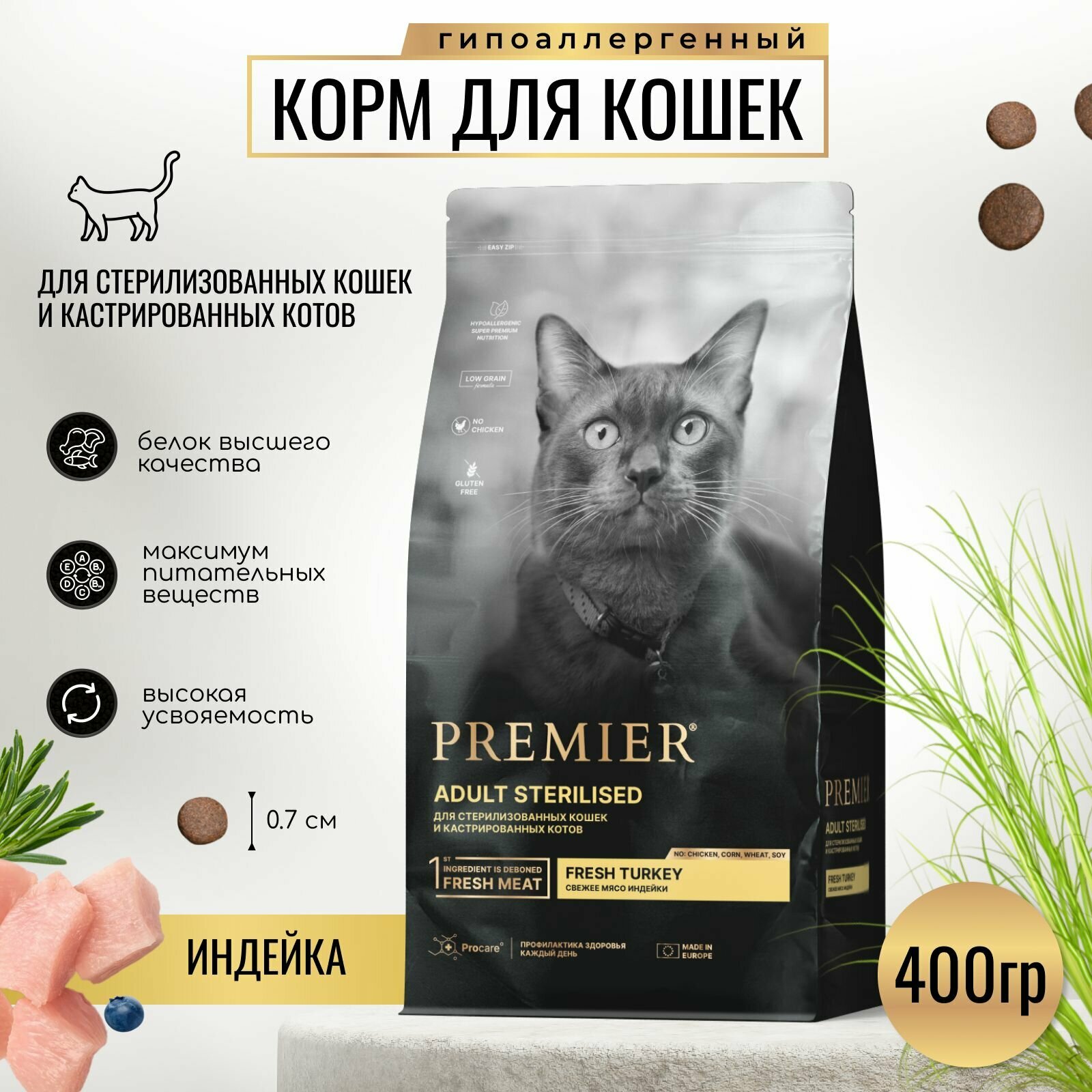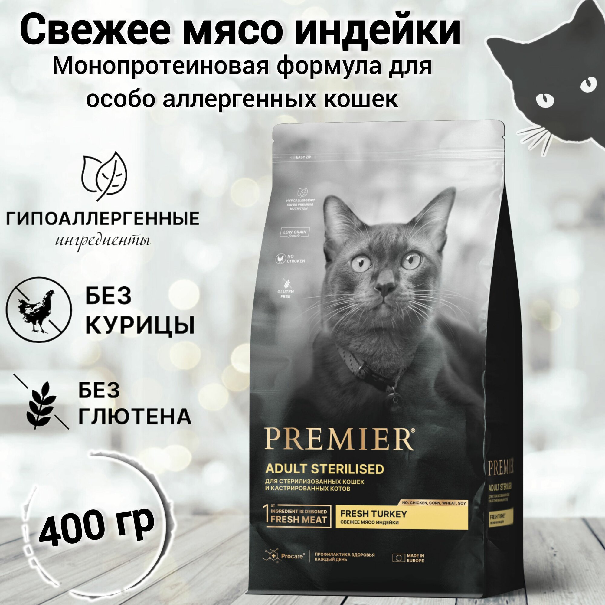 Сухой корм для стерилизованных кошек и кастрированных котов Premier при чувствительном пищеварении, индейка 0,4 кг