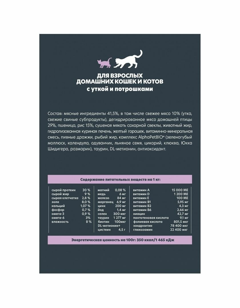 Сухой полнорационный корм с уткой и потрошками для взрослых домашних кошек и котов АльфаПет 0,35 кг